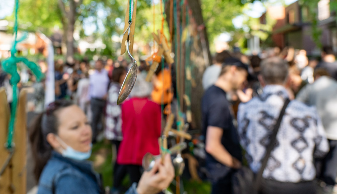 Les spectateurs sont invités à prendre deux cuillères (en guide de percussion!) devant la maison où se déroule la Chasse-Balcon. (Photo: François Robert-Durand, JDV)