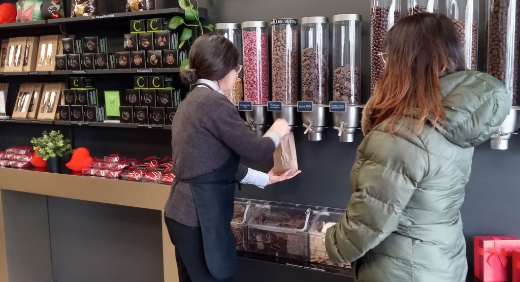 Une employée de chez Cotard Chocolatier Fleury emballe les achats d’une cliente. Photo : Katina Diep / JDV