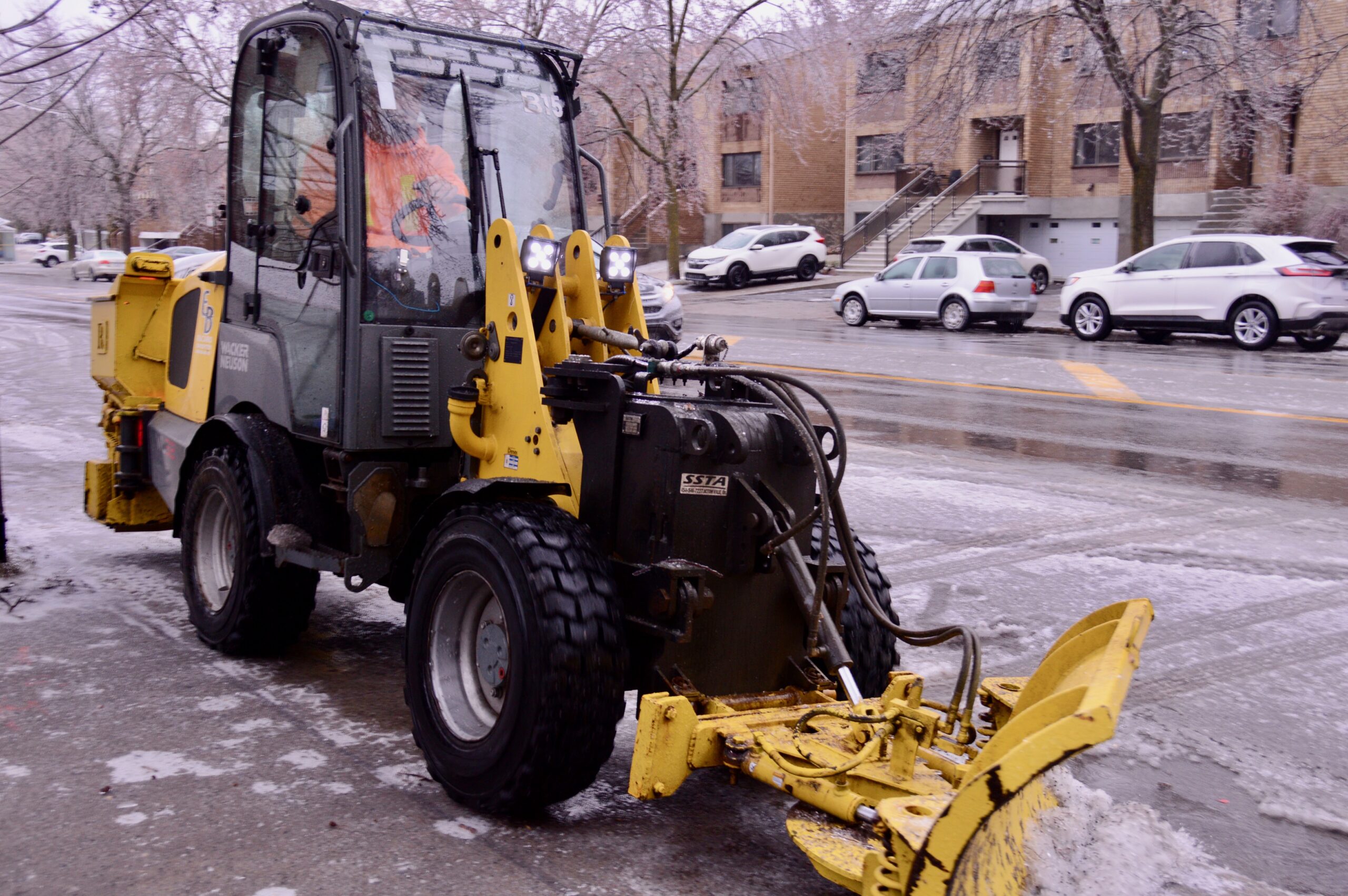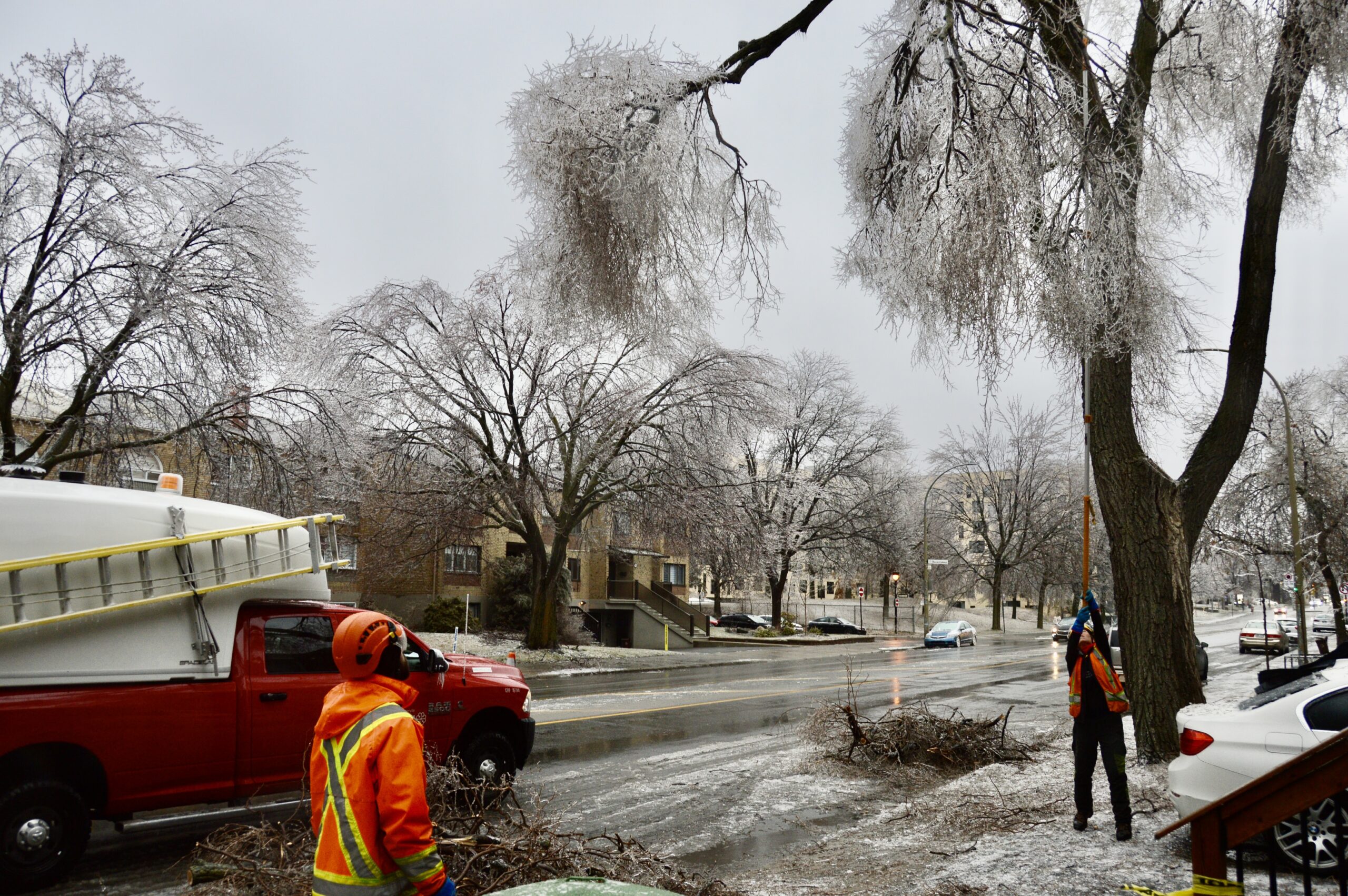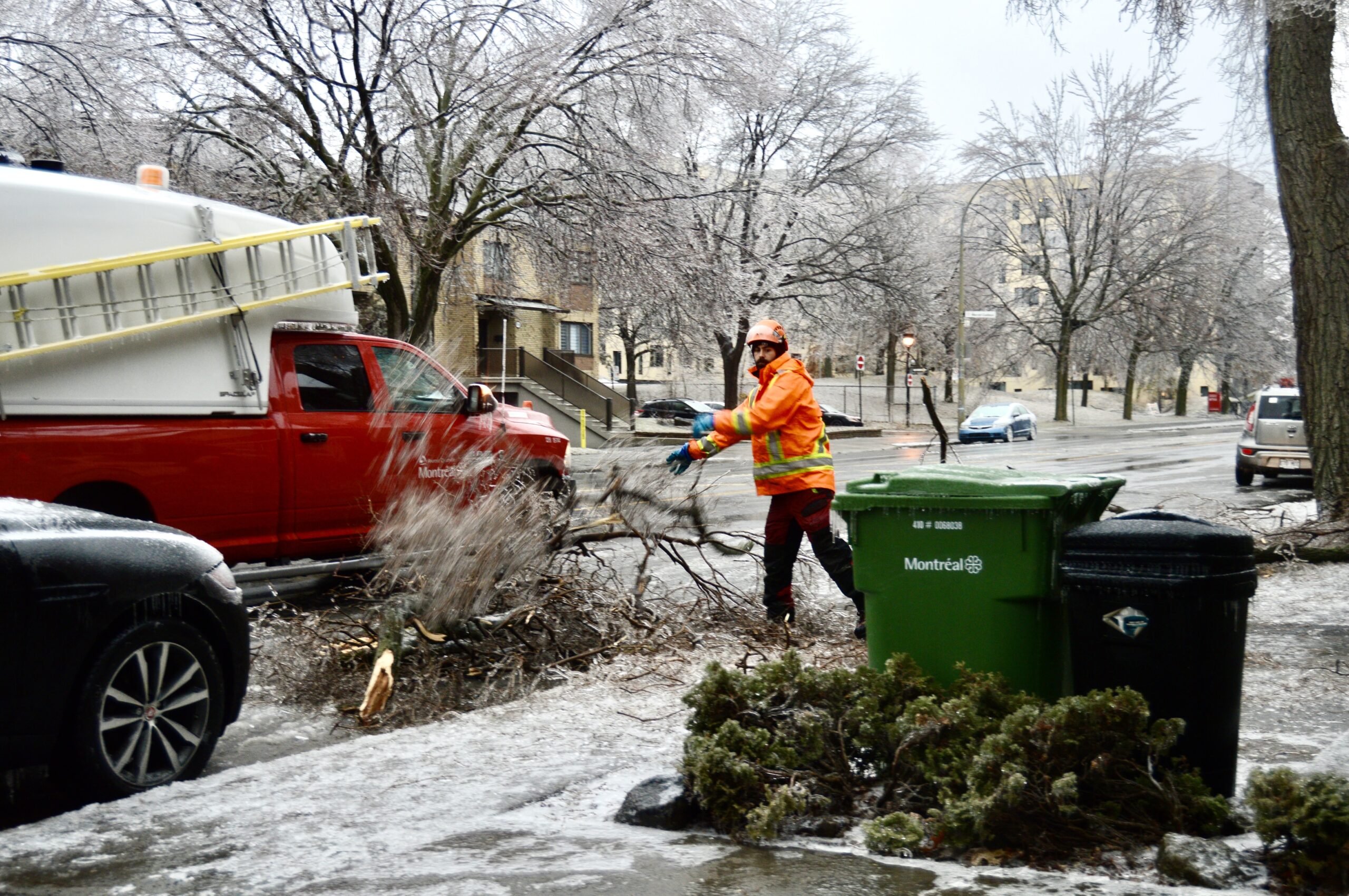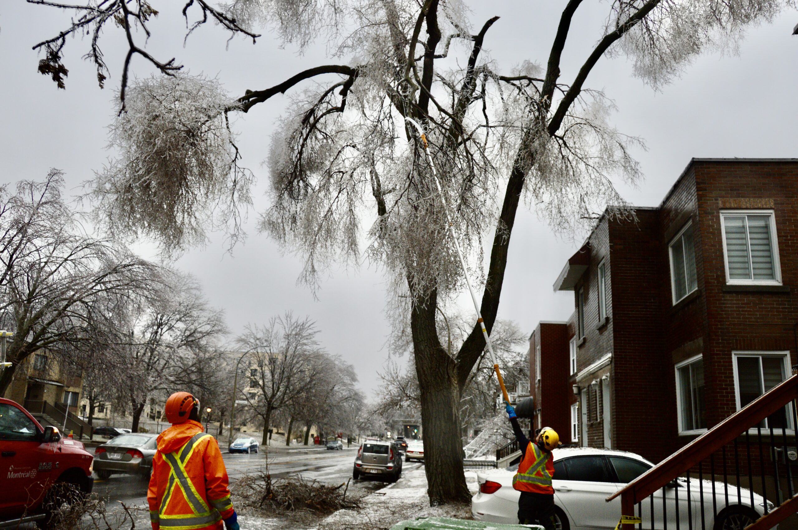 Un des employés nous a expliqué que leur tâche était de «sécuriser» les voies publiques, en regroupant sur le bord des trottoirs les branches tombées sur le terrain des résidants et dans la rue. D’après lui, c’est surtout les ormes qui sont fragiles et leurs branches se rompent facilement sous le poids de la glace.
